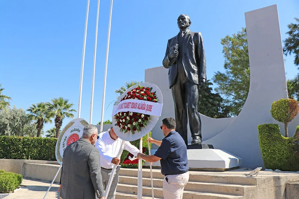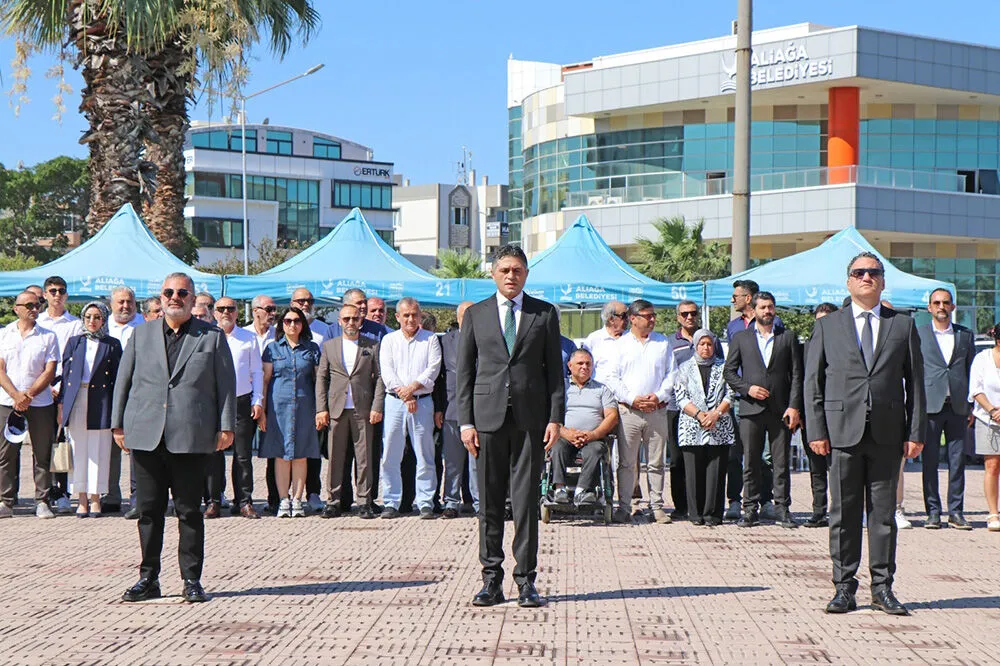 Aliağa Cumhuriyet Meydanı’nda gerçekleştirilen resmi tören, Aliağa Bölge Liman Başkan Vekili Günhur Şanlı ve İMEAK Deniz Ticaret Odası Aliağa Şubesi Yönetim Kurulu Başkanı Adem Şimşek’in Atatürk Anıtı’na çelenk sunmasıyla başladı. Törende saygı duruşunda bulunuldu ve İstiklal Marşı okundu.