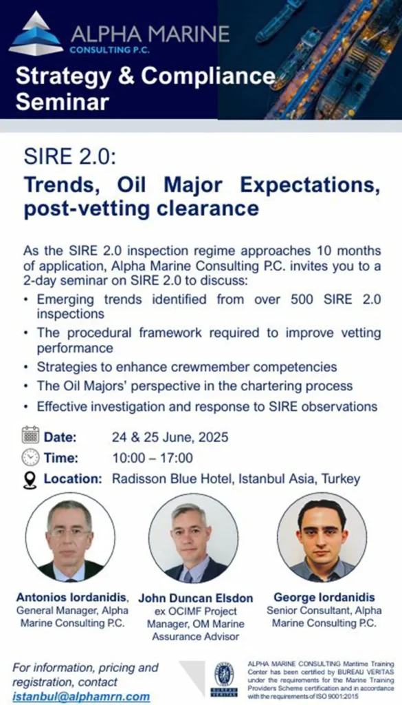 Uluslararası denizcilik sektöründe 35 yılı aşkın deneyimiyle öne çıkan ve dünya genelinde saygın bir danışmanlık şirketi olan Alpha Marine Consulting, Türkiye yapılanması Alpha Marine Consulting Turkey iş birliğiyle SIRE 2.0 sistemine odaklanan iki günlük bir seminer düzenliyor.