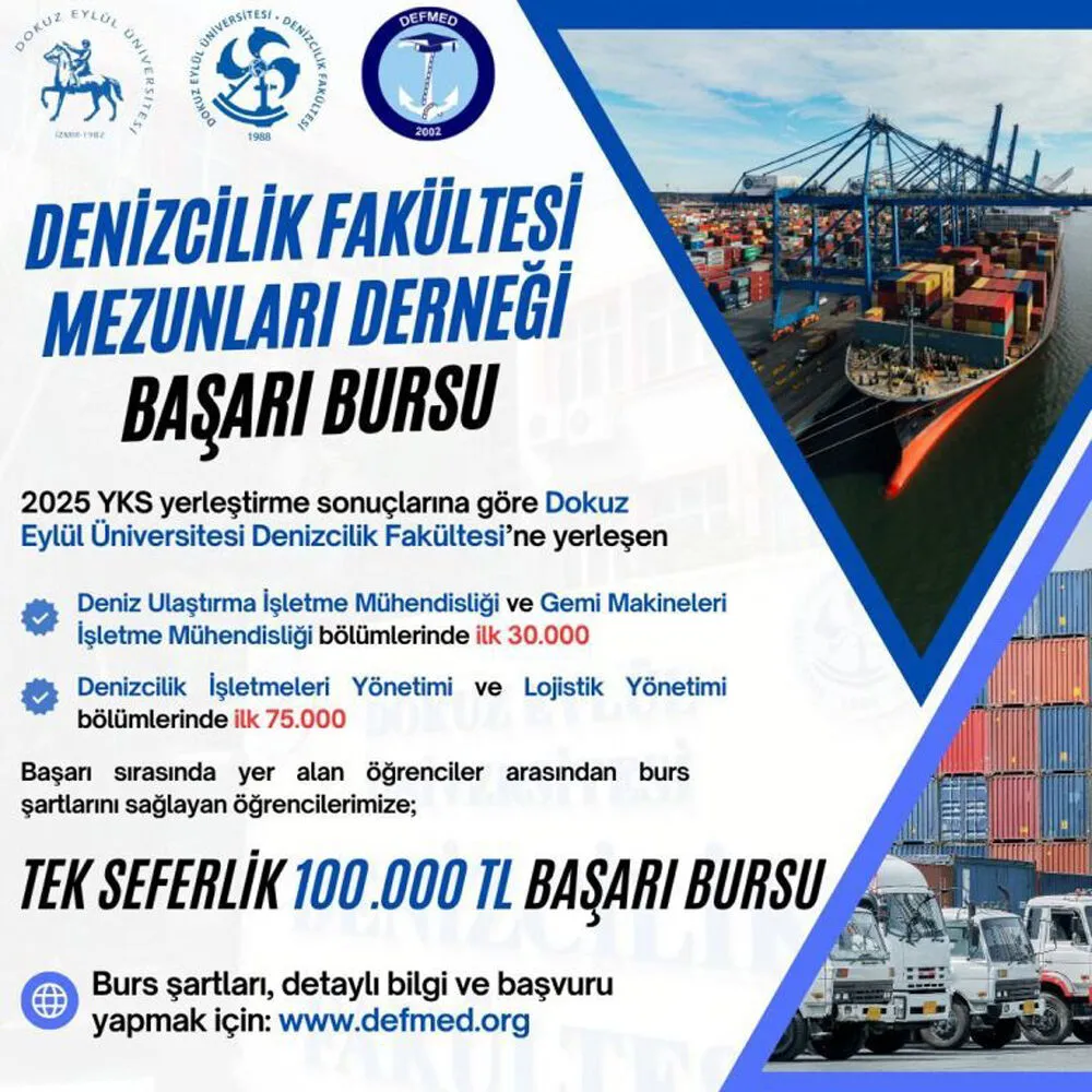 Dokuz Eylül Üniversitesi Denizcilik Fakültesi Mezunları Derneği (DEFMED), 2025-YKS yerleştirme sonuçlarına göre fakülteye yerleşen başarılı öğrencilere yönelik 100 bin TL’lik tek seferlik başarı bursu vereceğini duyurdu.