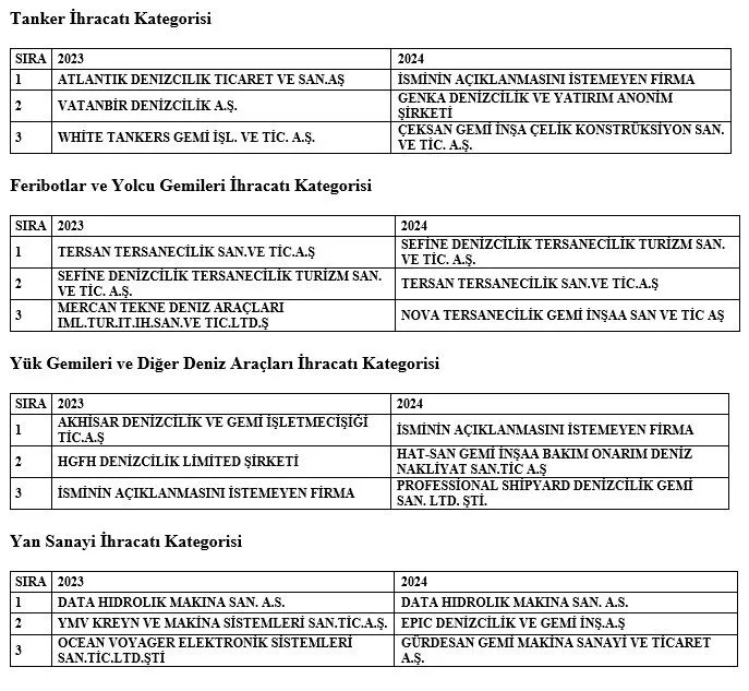 Sektörel bazda bakıldığında; 2024 yılında Balıkçı Gemisi ihracatı kategorisinin lideri Sirena Marine Denizcilik olurken; Römorkör ihracatı kategorisinde, Sanmar Denizcilik; 24 Metre Üstü Yat ihracatı kategorisinde, TİSG Turkey Yat Tersanecilik; 24 Metre Altı Yat ihracatı kategorisinde, Sirena Marine Denizcilik; Tanker İhracatı kategorisinde, isminin açıklanmasını istemeyen bir firma; Feribotlar ve Yolcu Gemileri ihracatı kategorisinde, Sefine Denizcilik Tersanecilik; Yük Gemileri ve Diğer Deniz Araçları ihracatı kategorisinde isminin açıklanmasını istemeyen bir firma; Yan Sanayi İhracatı Kategorisinde ise DATA Hidrolik Makine zirvede yerlerini buldu.