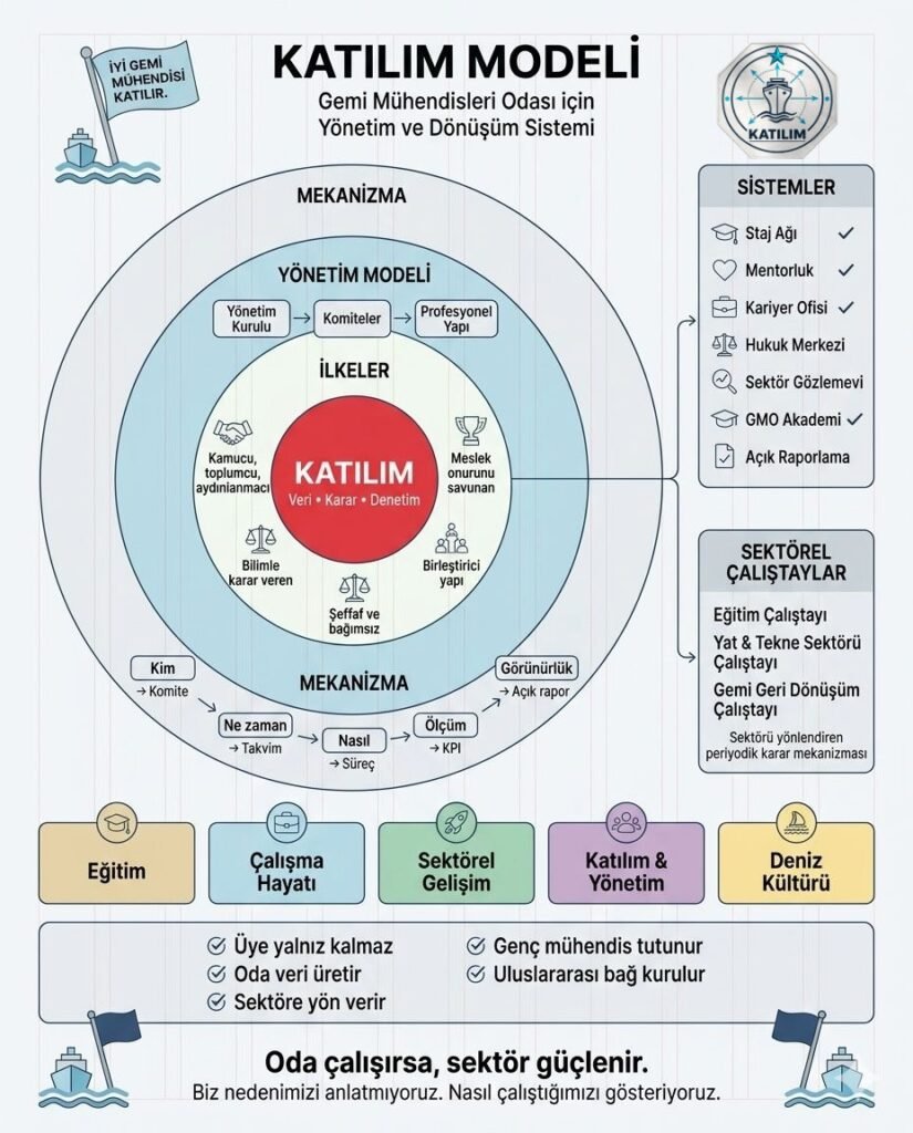 “Bu bir seçim programı değil, bir yönetişim modeli. Eğer doğru kurulursa, sadece odamızı değil, meslek örgütlerinin genel çalışma biçimini de değiştirebilir. Bu seçimde asıl soru şu: Kurumlar alışkanlıkla mı yönetilecek, yoksa sistemle mi? Biz sistem kurmayı öneriyoruz. Katılım iyidir. İyi gemi mühendisi katılır.”