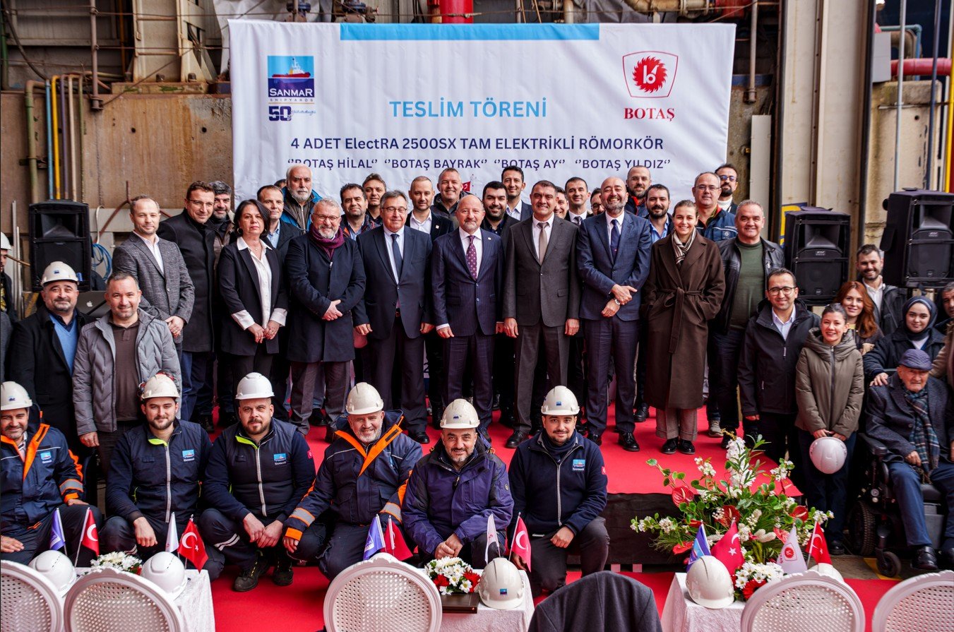 Türkiye’nin enerji arz güvenliği ve denizcilikte yeşil dönüşüm hedefleri doğrultusunda önemli bir adım daha atıldı. SANMAR, kuruluşunun 50. yılında BOTAŞ (Boru Hatları ile Petrol Taşıma A.Ş.) için inşa ettiği ileri teknolojiye sahip dört adet tam elektrikli römorkörün teslimatını gerçekleştirdi.