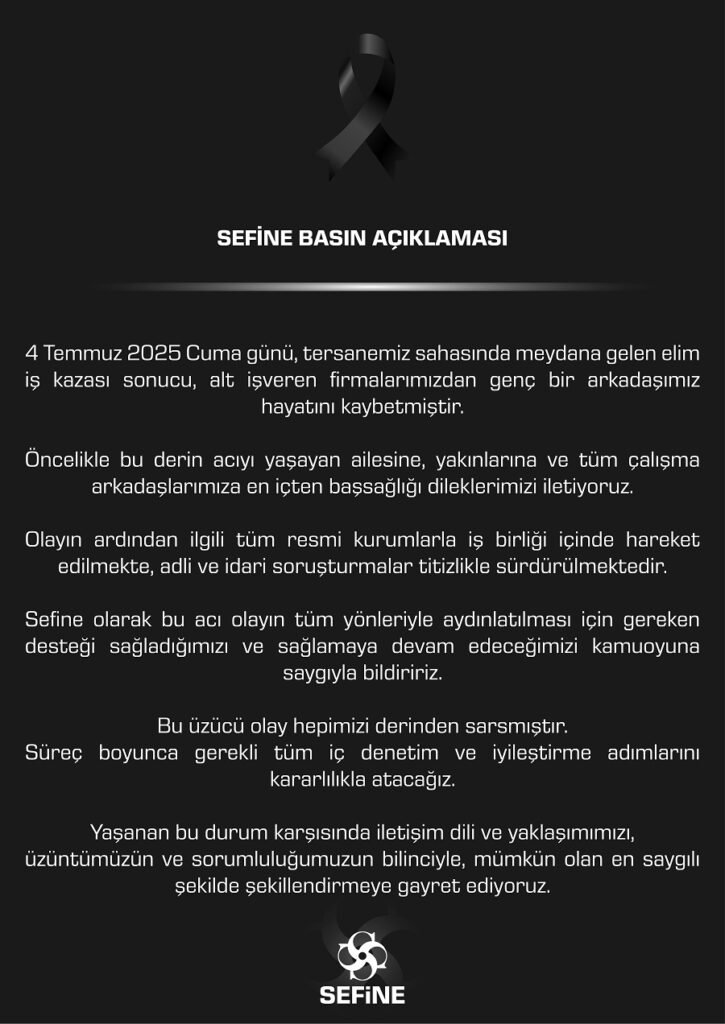 Kaza ile ilgili açıklama yapan Sefine Tersanesi, öncelikle hayatını kaybeden çalışanın ailesine, yakınlarına ve tüm çalışma arkadaşlarına başsağlığı dileklerini iletti. Açıklamada, kazanın ardından tüm resmi kurumlarla iş birliği içerisinde hareket edildiği, adli ve idari soruşturmaların titizlikle sürdürüldüğü belirtildi.