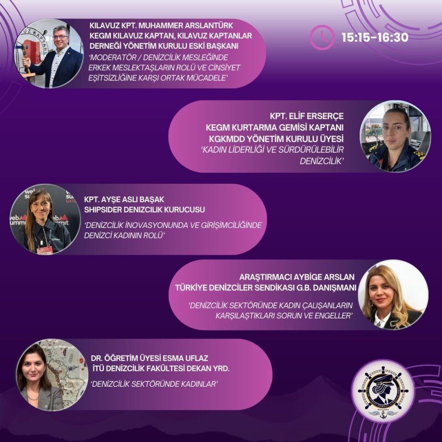 İkinci oturum ise 15.15–16.30 saatlerinde Kılavuz Kaptan Muhammer Arslantürk’ün moderatörlüğünde düzenlenecek. Bu bölümde KEGM Kurtarma Gemisi Kaptanı Kpt. Elif Erserçe, Shipsider Kurucusu Kpt. Ayşe Aslı Başak, Türkiye Denizciler Sendikası Danışmanı Aybüge Arslan ve İTÜ Denizcilik Fakültesi’nden Dr. Öğr. Üyesi Esma Uflaz söz alacak.