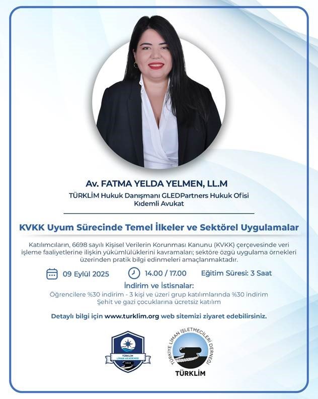 9 Eylül 2025 Salı günü 14.00–17.00 saatleri arasında çevrim içi olarak gerçekleştirilecek eğitimi, GLEDPartners Hukuk Ofisi Kıdemli Avukatı Av. Fatma Yelda Yelmen, LL.M verecek. Eğitimde katılımcılara, 6698 sayılı Kişisel Verilerin Korunması Kanunu kapsamında veri işleme faaliyetlerine ilişkin yükümlülükler aktarılacak, ayrıca liman ve lojistik sektörüne özgü uygulama örnekleriyle pratik bilgiler sunulacak.